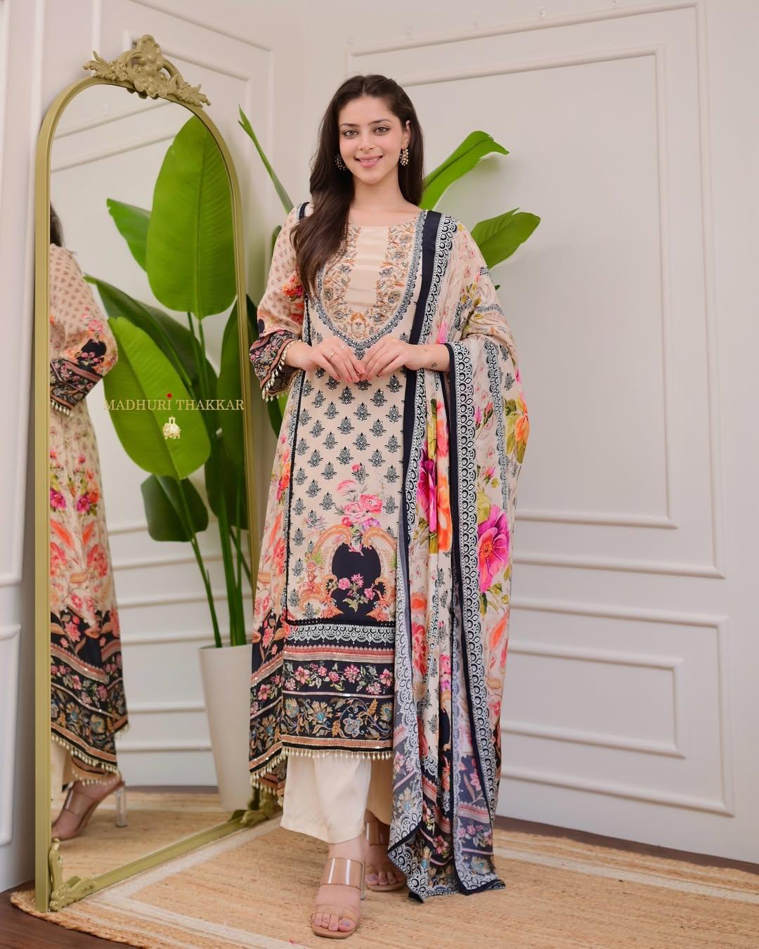 *Our Exclusive Collection is here, to add a touch of tradition to your wardrobe.* *This is a graceful and elegant outfit, likely a three-piece set consisting of a Kurta, Salwar, and Dupatta. It features a blend of digital print, hand embroidery, and embellishments.* *specified Chinon as the base fabric. Chinon is a lightweight, slightly sheer fabric known for its good drape and subtle sheen, making it suitable for such outfits.*